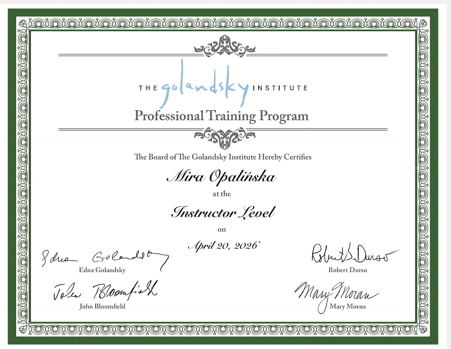 I'm honoured to say, that I've been granted the Instructor Level in the prestigious Taubman Approach Teacher Training by The Golandsky Institute, and from now on I'm Certified Taubman Teacher. This achievement means I've become the first and only certified Taubman piano teacher for Poland and the second in the UK (1st in Scotland!)